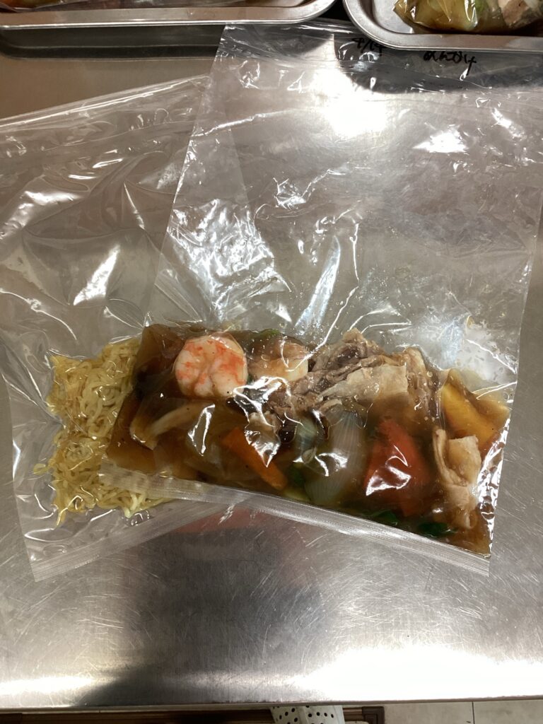 • こんにちは、エシベジです。加工プログラムであんかけ焼きそば作りを行いました。エシベジには、ブラストチラー、真空パック機、業務用スチームコンベクション、があり、大量調理、衛生管理の点で非常に重宝しています。今回もこの設備を利用して、ご利用者さまの昼食の質の向上をはかっています。みなさまに喜んでいただけるメニュー作りを目指していきます。