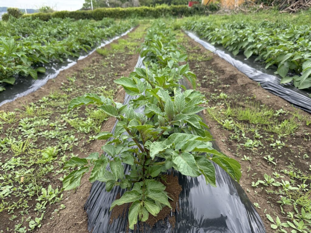 2026年4月21日 ブログ じゃがいもの芽かき 春の陽気を通り越して初夏に近い気温の中ジャガイモの苗がすくすくと育っていました。 立派に育った苗ですが芽の数が多いと小芋になりやすいので育ちの良い芽だけを残す芽かき作業を行いました。 これからどんどん暑くなるのでこの暑さに負けないように頑張ります