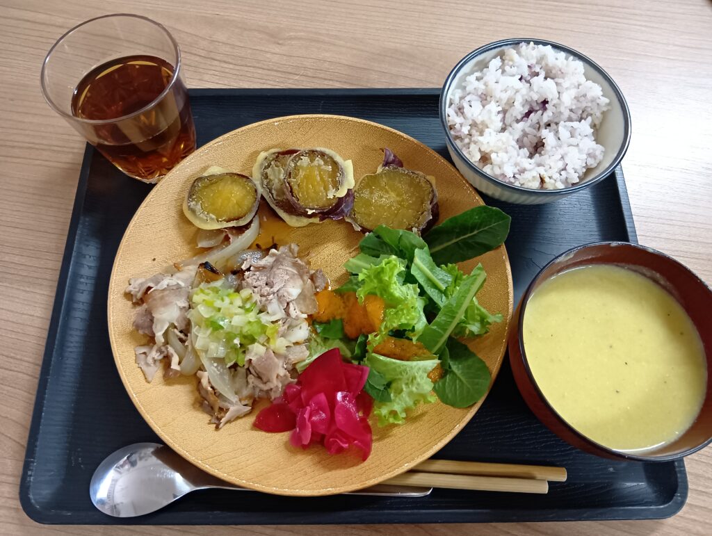 豚肉のネギ塩、サツマイモの天ぷら、サツマイモご飯、サラダや人参スープも付いて、まさにカフェにあるランチプレートのような昼食!色とりどりの料理だと食欲が増しますね!