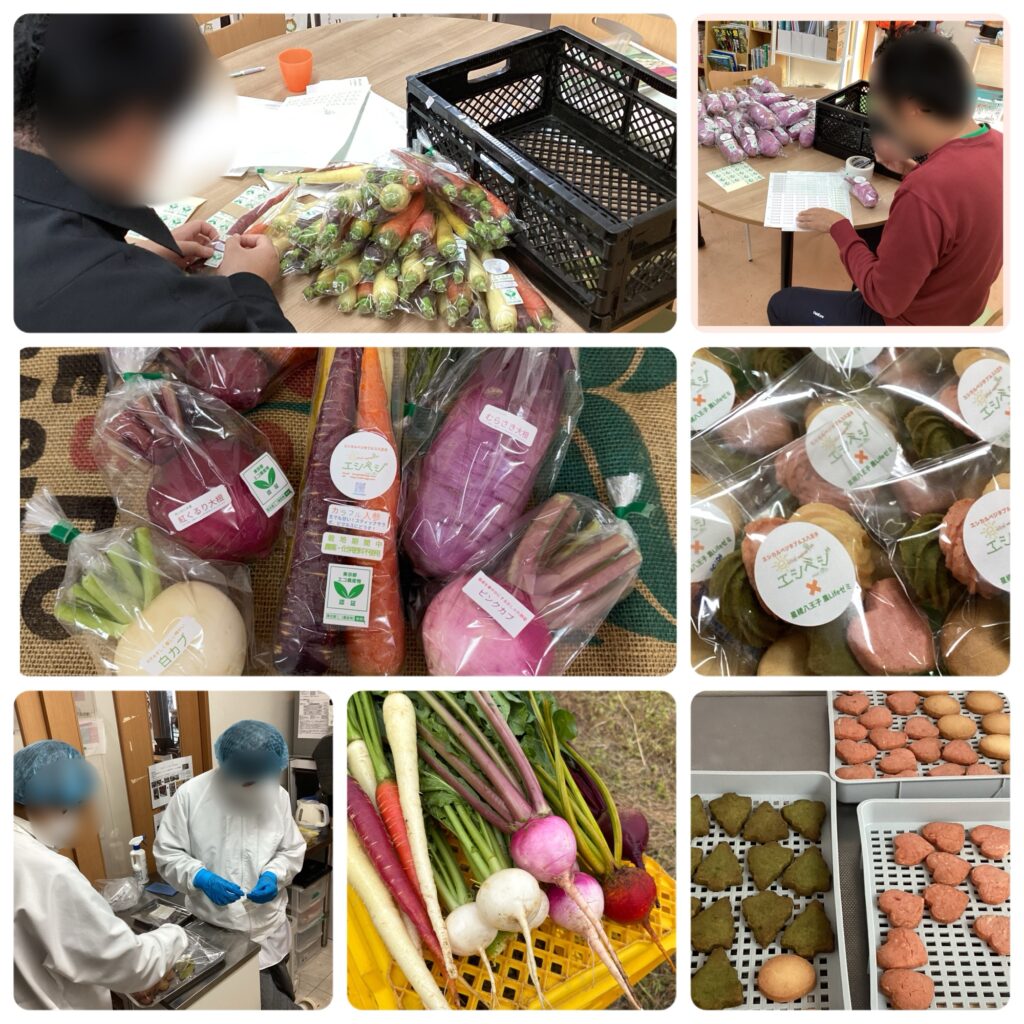 エシベジの代表渡辺が「農Lifeゼミ」星槎の授業の1コマを担当させていただいているご縁もあり、明日は旬のカラフル野菜だけでなく、エシベジ×農Lifeゼミのコラボ商品「3色クリスマスクッキー」(プレーン、ビーツにんじんの葉)も販売します。授業を使って、試作や包装作業を一緒に行ってきました。もちろん、エシベジの利用者のみなさまも、このクッキー作りや生徒さんのサポートに参加しています。